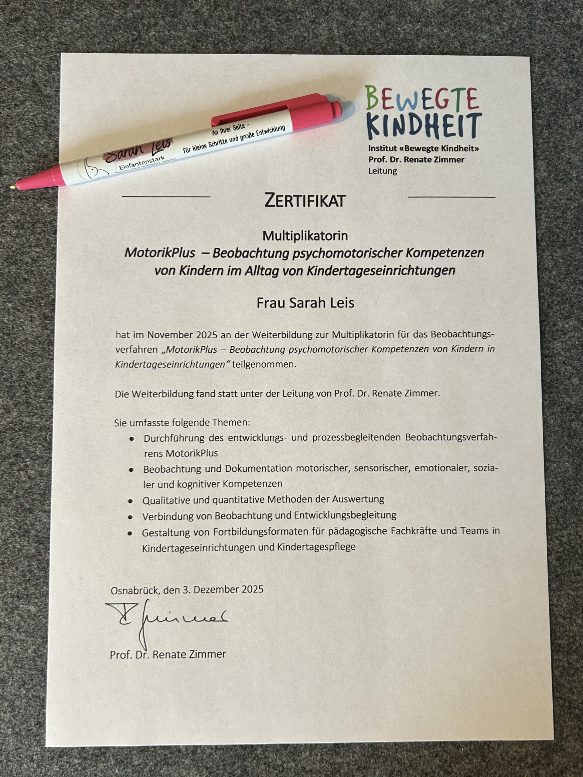 Zertifiziert durch Renate Zimmer biete ich Schulungen zum Beobachtungsverfahren MotorikPlus an.
